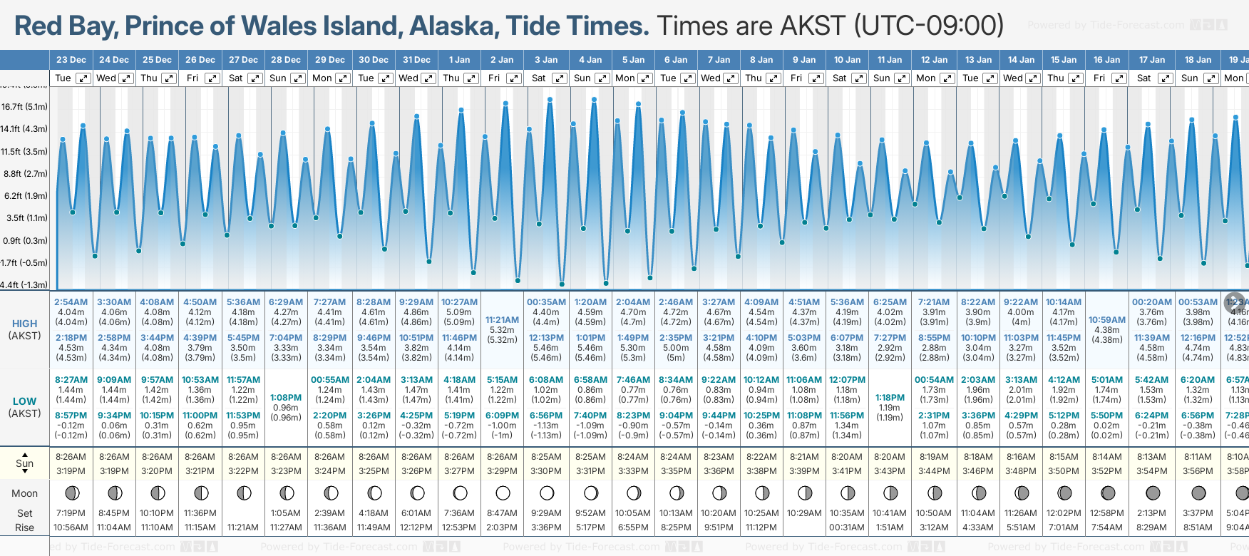 December and January Tide charts for Red Bay, Prince of Wales Island: The tide charts below show the height, time and date of high and low tides for the next 30 days.