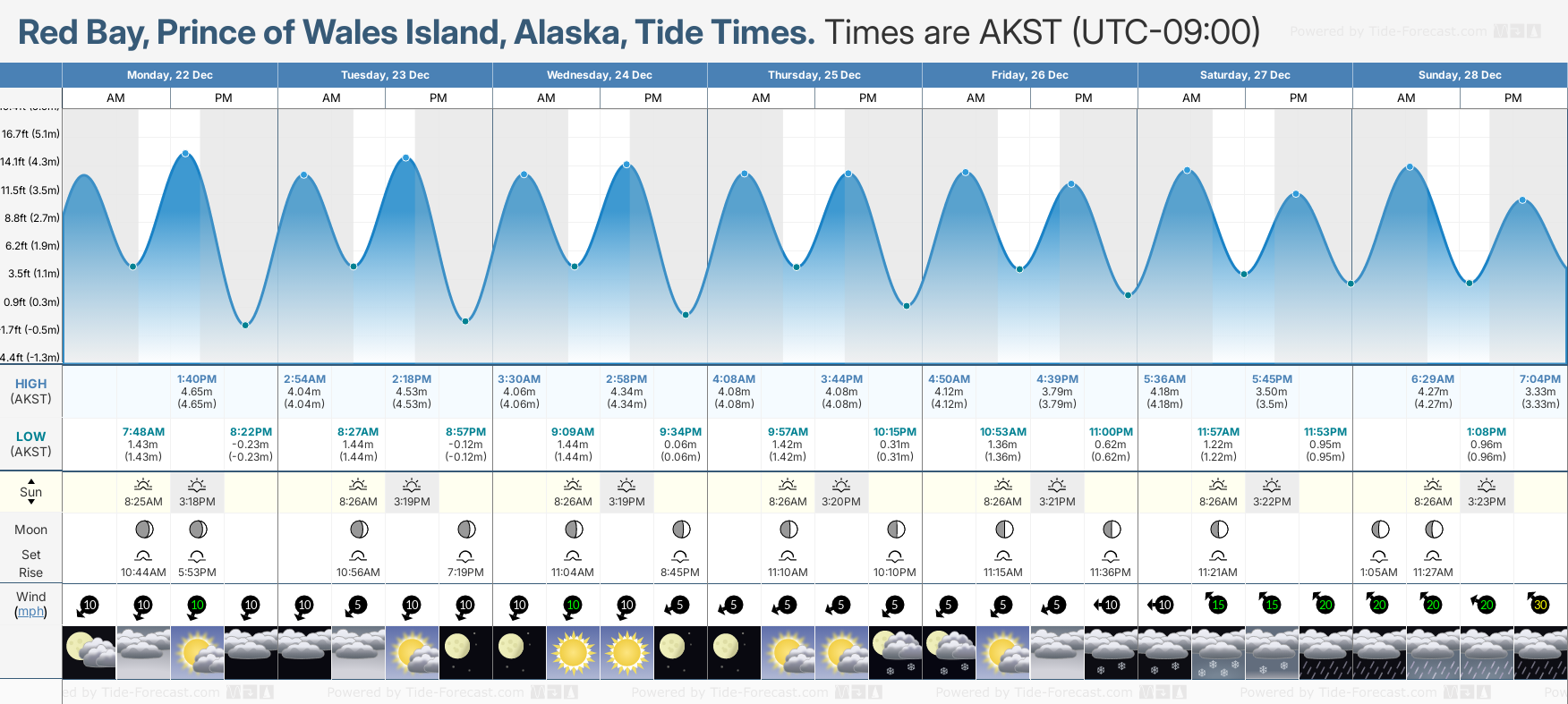 Tide Times are AKST (UTC -9.0hrs). Last Spring High Tide at Red Bay, Prince of Wales Island was on Sun 21 Dec (height: 4.71m 15.5ft). Next high Spring Tide at Red Bay, Prince of Wales Island will be on Sat 03 Jan (height: 5.46m 17.9ft).