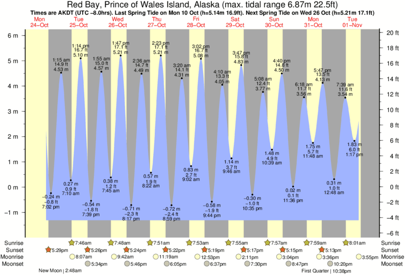 Tide Times are AKST (UTC -9.0hrs). Last Spring High Tide at Red Bay, Prince of Wales Island was on Fri 05 Dec (height: 5.61m 18.4ft). Next high Spring Tide at Red Bay, Prince of Wales Island will be on Sun 21 Dec (height: 4.71m 15.5ft).