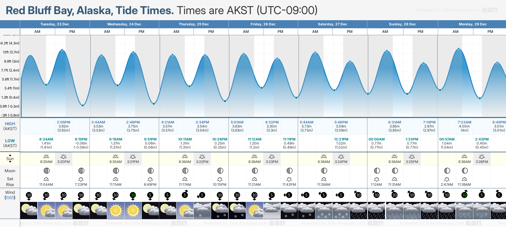 Tide Times are AKST (UTC -9.0hrs). Last Spring High Tide at Red Bluff Bay was on Sat 20 Dec (height: 4.10m 13.5ft). Next high Spring Tide at Red Bluff Bay will be on Sat 03 Jan (height: 4.59m 15.1ft).