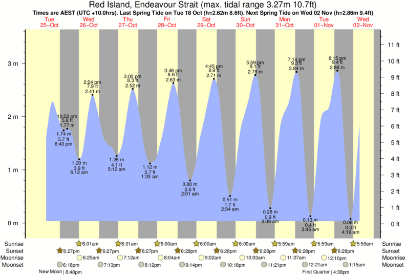 Red Island tide chart key: The tide chart above shows the height and times of high tide and low tide for Red Island, Endeavour Strait. The grey shading corresponds to nighttime hours between sunset and sunrise at Red Island.