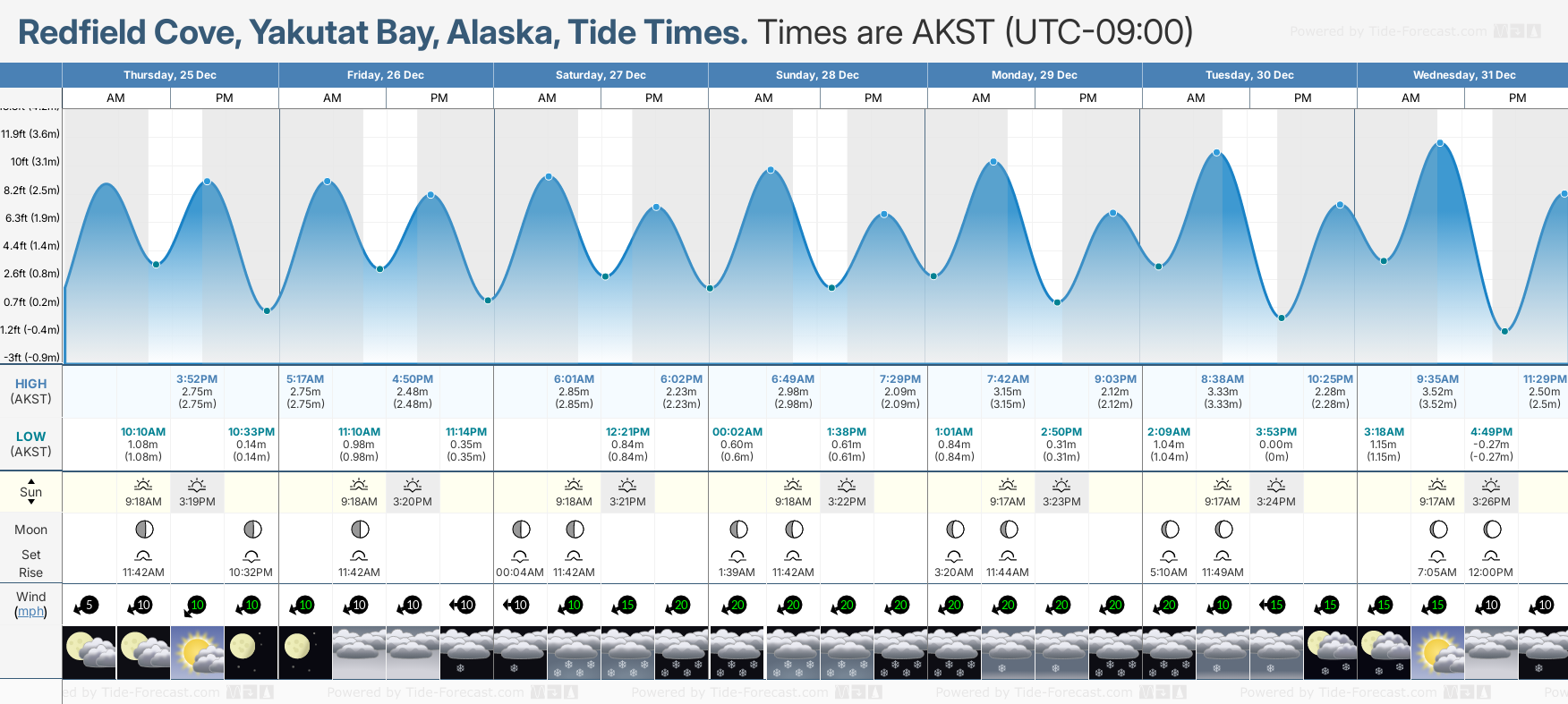 Today's tide times for Redfield Cove, Yakutat Bay: Thursday 25 December 2025