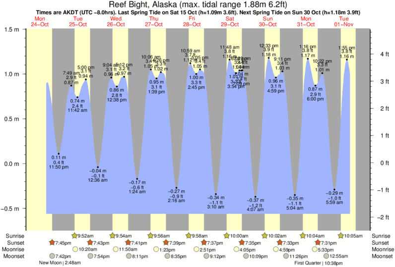 Tide Times are AKST (UTC -9.0hrs). Last Spring High Tide at Reef Bight was on Sat 20 Dec (height: 1.12m 3.7ft). Next high Spring Tide at Reef Bight will be on Thu 01 Jan (height: 1.34m 4.4ft).