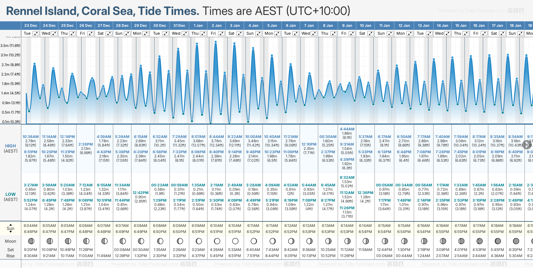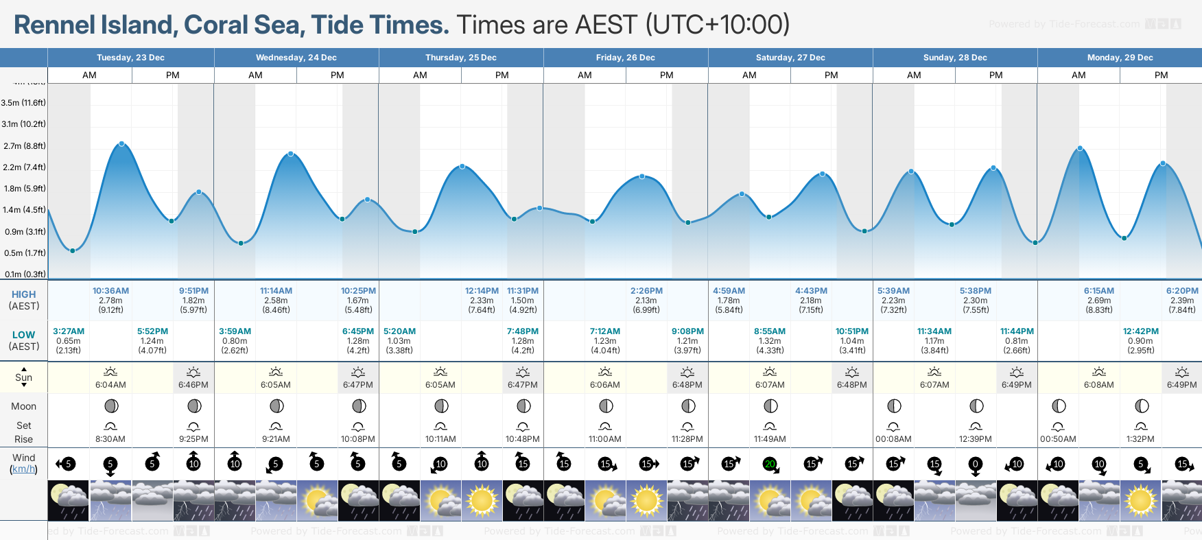 Tide Times are AEST (UTC +10.0hrs). Last Spring High Tide at Rennel Island was on Fri 19 Dec (height: 3.04m 10.0ft). Next high Spring Tide at Rennel Island will be on Fri 02 Jan (height: 3.76m 12.3ft).