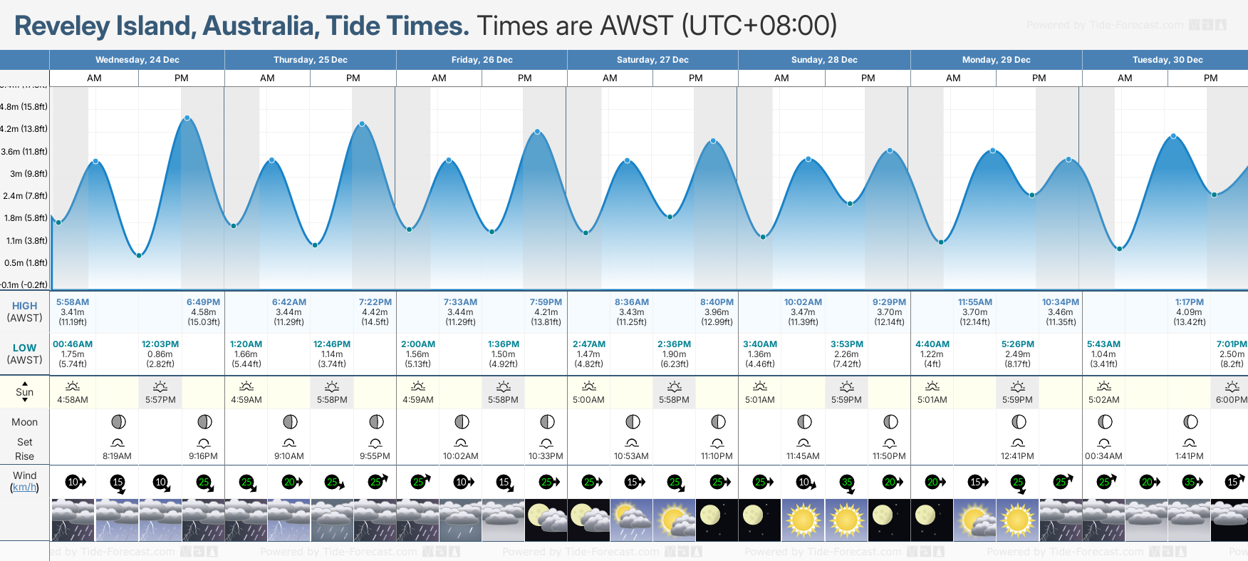 Tide Times are AWST (UTC +8.0hrs). Last Spring High Tide at Reveley Island was on Mon 22 Dec (height: 4.78m 15.7ft). Next high Spring Tide at Reveley Island will be on Sun 04 Jan (height: 5.14m 16.9ft).