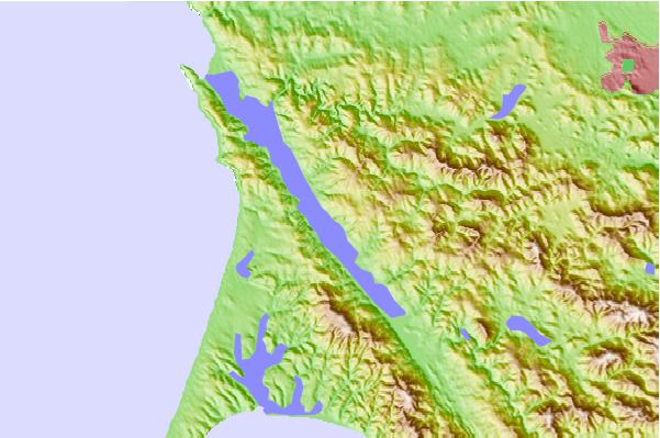 Use this relief map to navigate to tide stations, surf breaks and cities that are in the area of Reynolds, Tomales Bay, California.