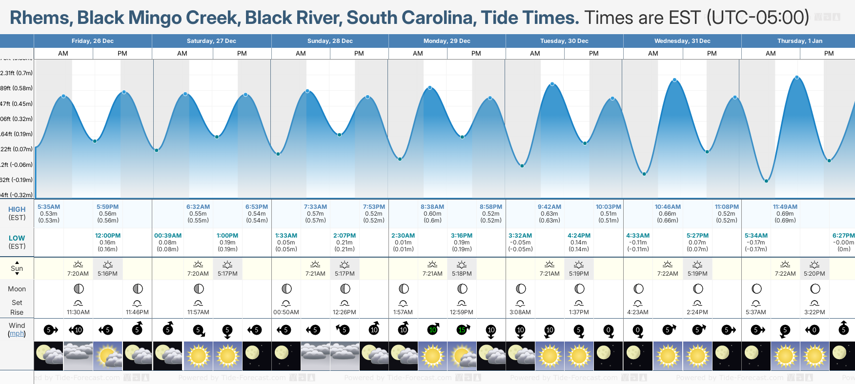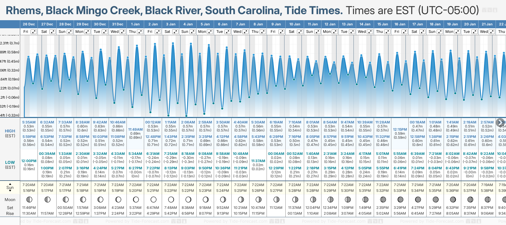 December and January Tide charts for Rhems, Black Mingo Creek, Black River: The tide charts below show the height, time and date of high and low tides for the next 30 days.