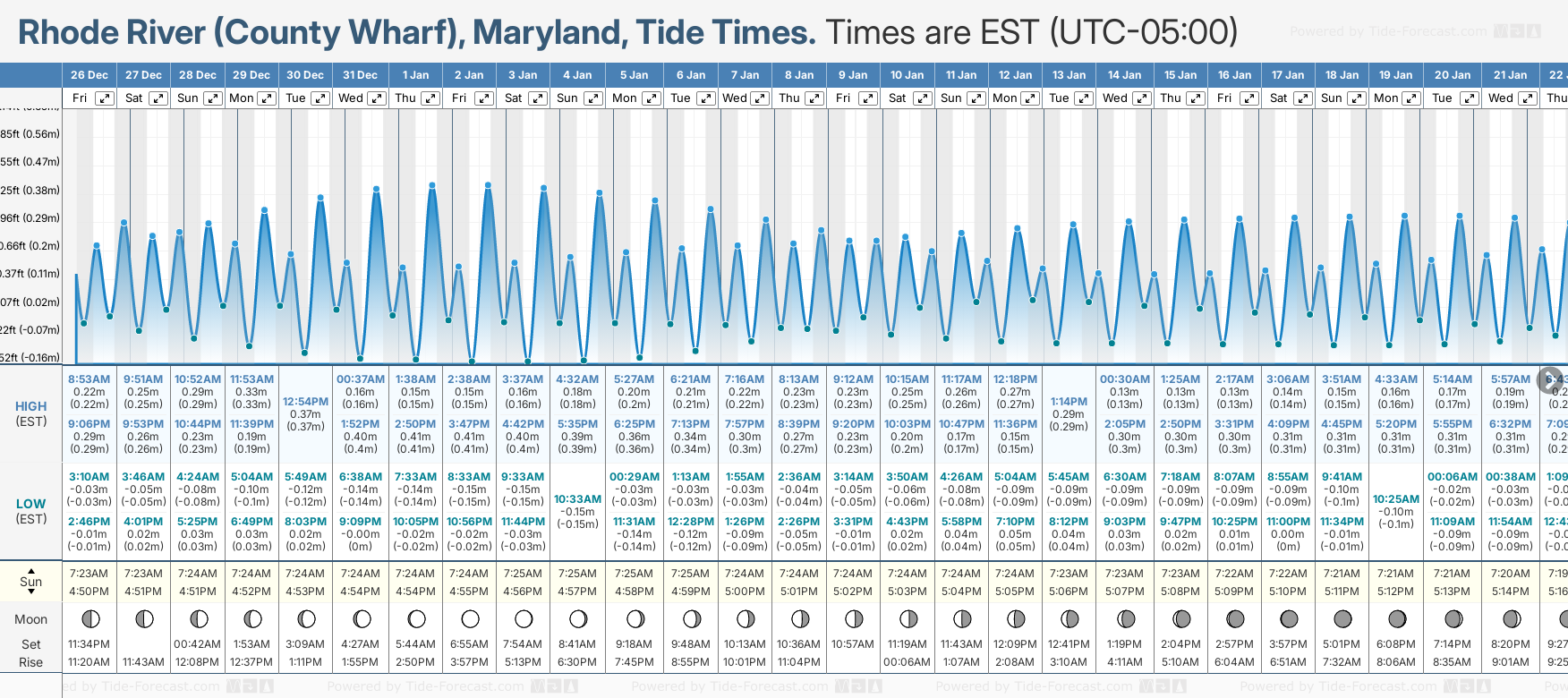 December and January Tide charts for Rhode River (County Wharf): The tide charts below show the height, time and date of high and low tides for the next 30 days.