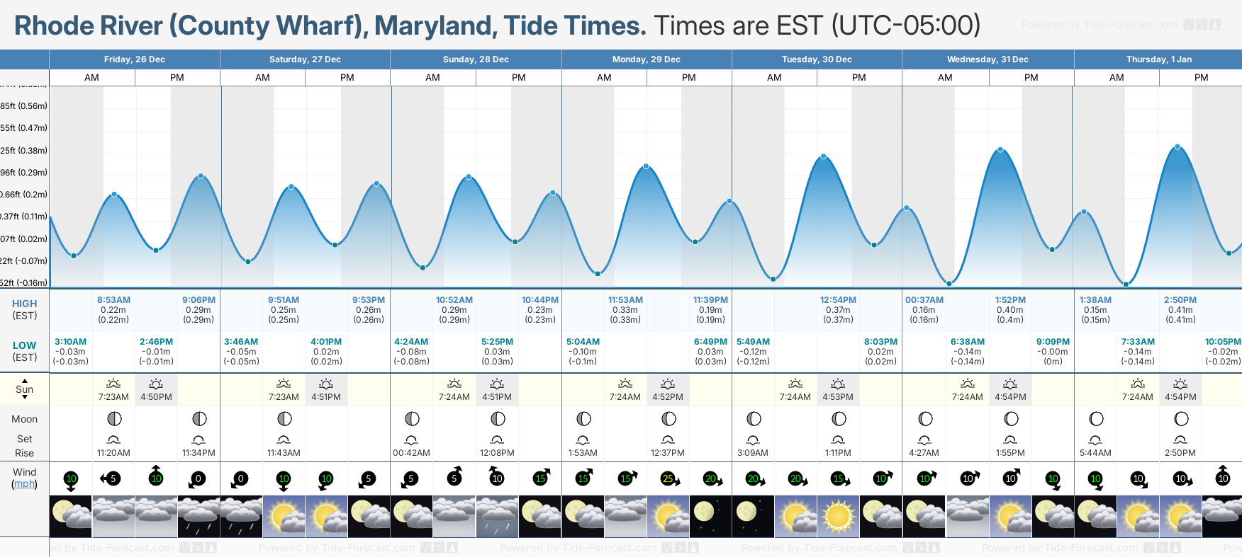 Tide chart for Rhode River (County Wharf)Showing low and high tide times for the next 30 days at Rhode River (County Wharf). Tide Times are EST (UTC -5.0hrs).