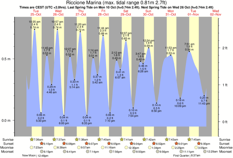 Tide Times are CET (UTC +1.0hrs). Last Spring High Tide at Riccione Marina was on Fri 19 Dec (height: 0.65m 2.1ft). Next high Spring Tide at Riccione Marina will be on Thu 01 Jan (height: 0.70m 2.3ft).