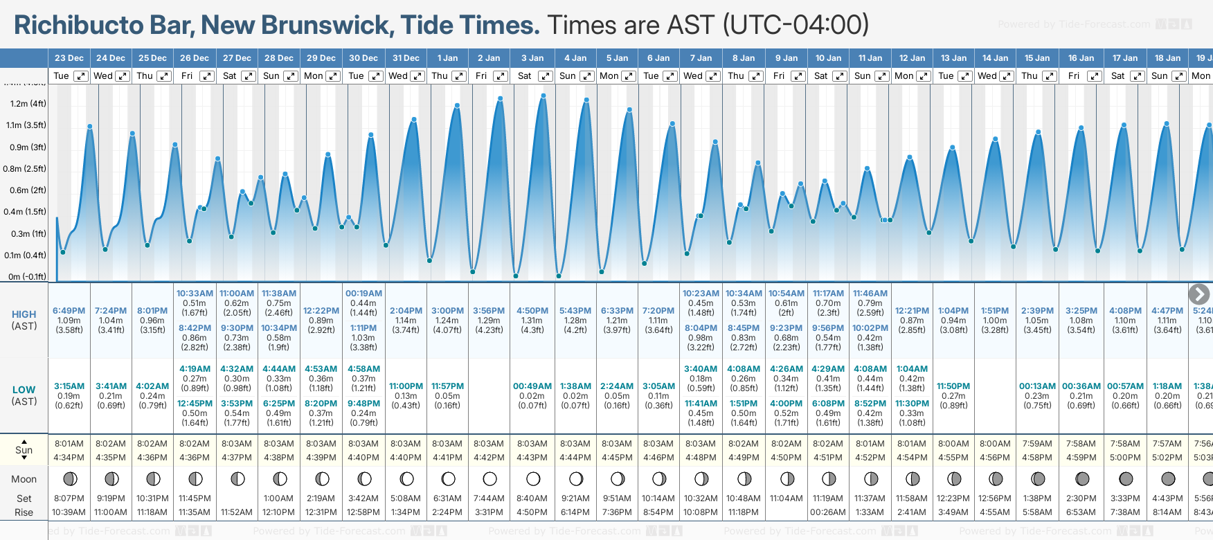 December and January Tide charts for Richibucto Bar: The tide charts below show the height, time and date of high and low tides for the next 30 days.