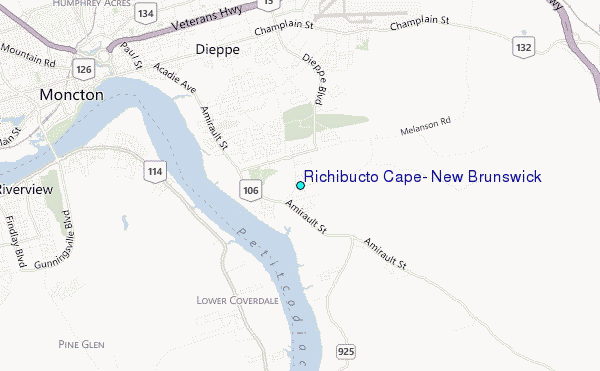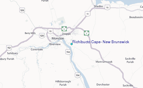Use this relief map to navigate to tide stations, surf breaks and cities that are in the area of Richibucto Cape, New Brunswick.