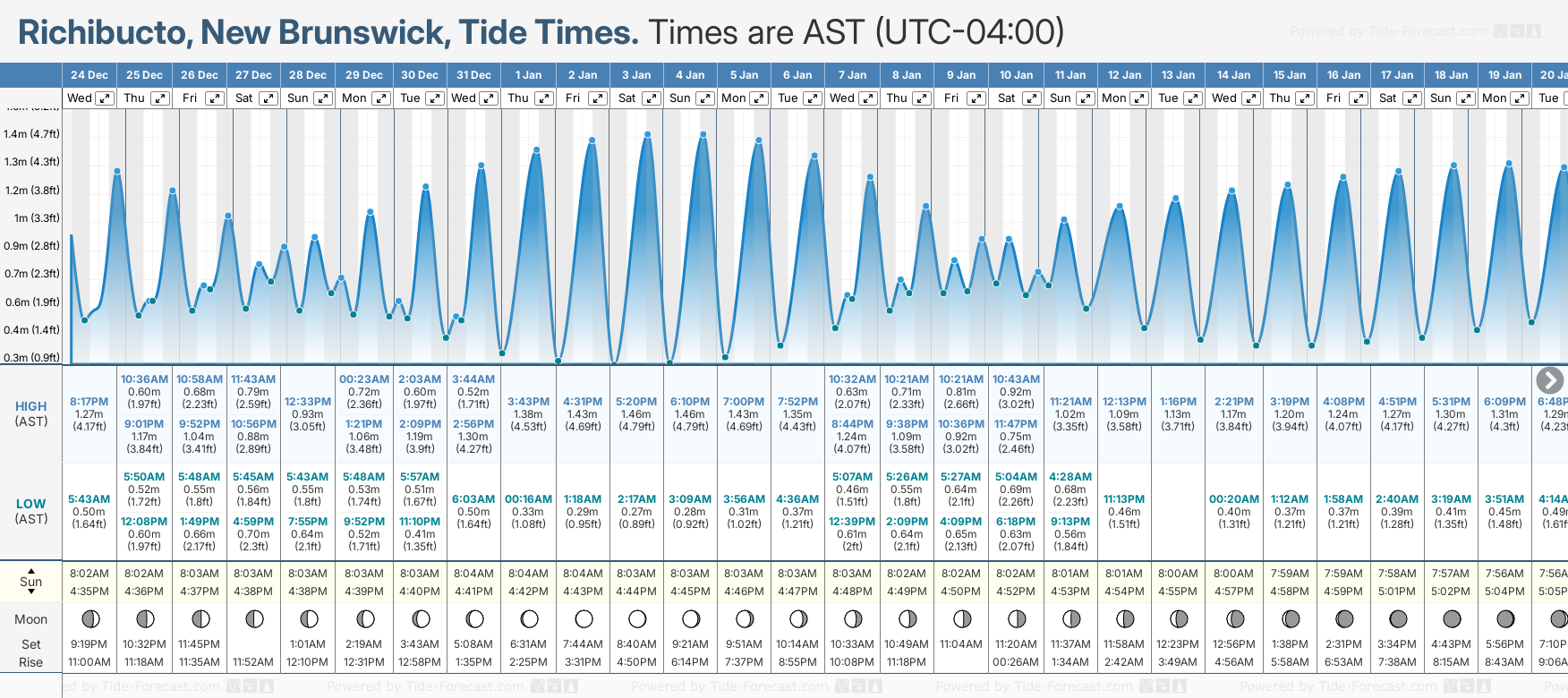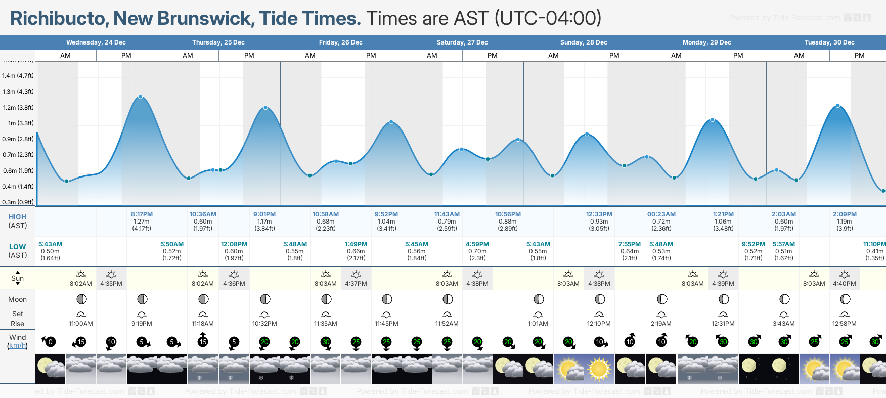Tide chart for RichibuctoShowing low and high tide times for the next 30 days at Richibucto. Tide Times are AST (UTC -4.0hrs).