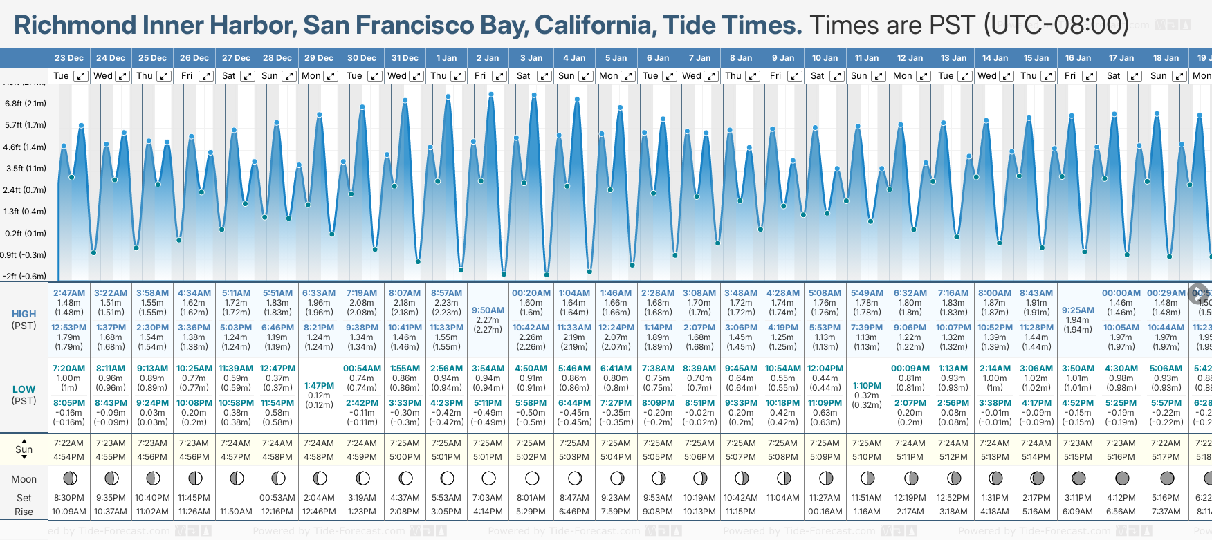 December and January Tide charts for Richmond Inner Harbor, San Francisco Bay: The tide charts below show the height, time and date of high and low tides for the next 30 days.
