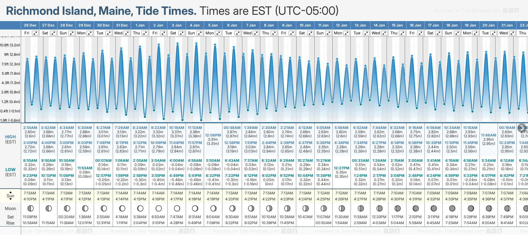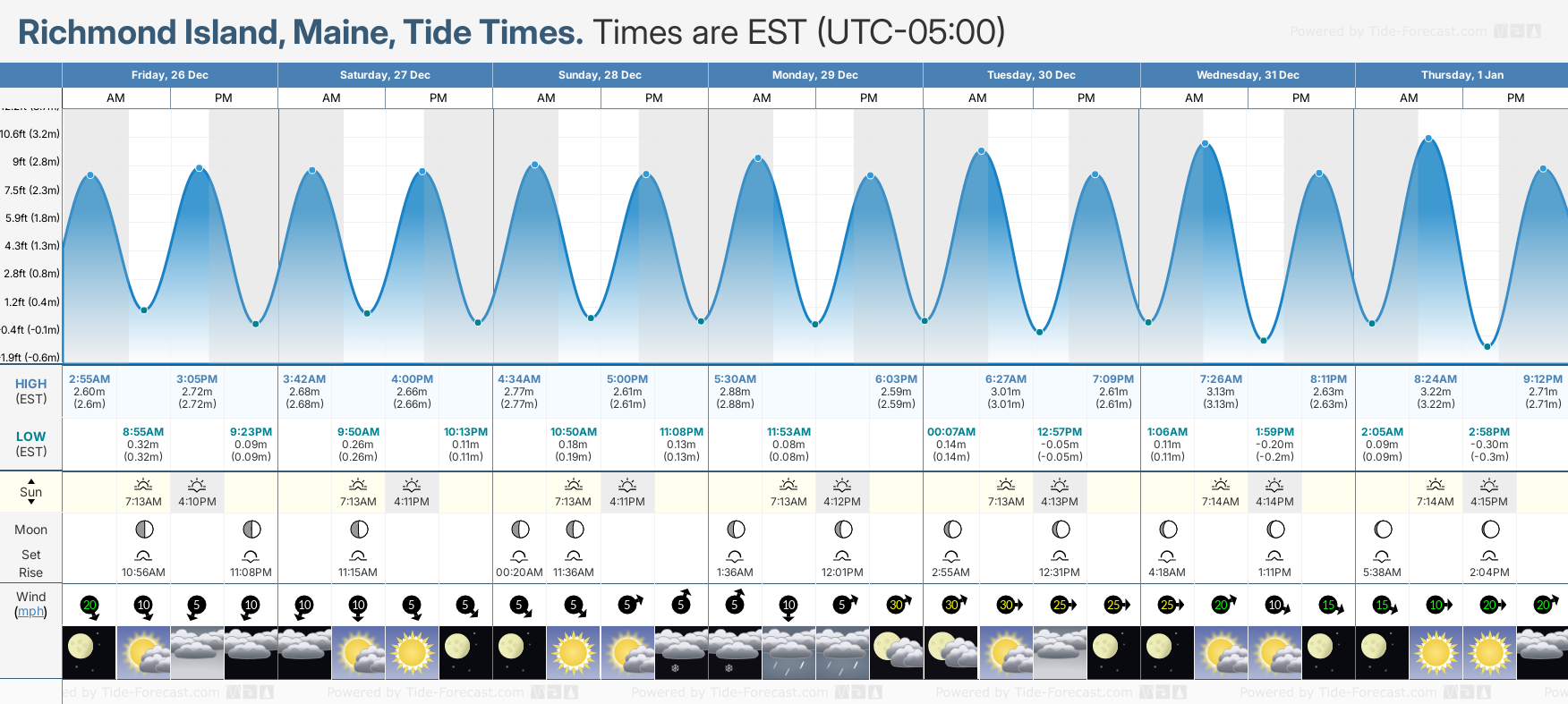 Tide Times are EST (UTC -5.0hrs). Last Spring High Tide at Richmond Island was on Mon 22 Dec (height: 2.85m 9.4ft). Next high Spring Tide at Richmond Island will be on Sun 04 Jan (height: 3.38m 11.1ft).