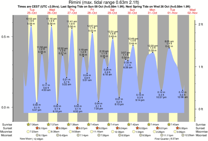 Tide chart for RiminiShowing low and high tide times for the next 30 days at Rimini. Tide Times are CET (UTC +1.0hrs).