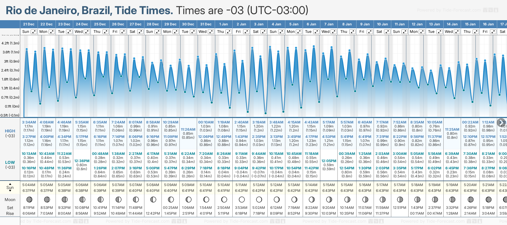 December and January Tide charts for Rio de Janeiro: The tide charts below show the height, time and date of high and low tides for the next 30 days.