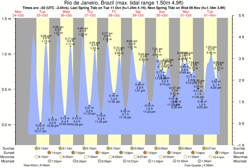 Tide Times are -03 (UTC -3.0hrs). Last Spring High Tide at Rio de Janeiro was on Sat 06 Dec (height: 1.19m 3.9ft). Next high Spring Tide at Rio de Janeiro will be on Mon 22 Dec (height: 1.19m 3.9ft).