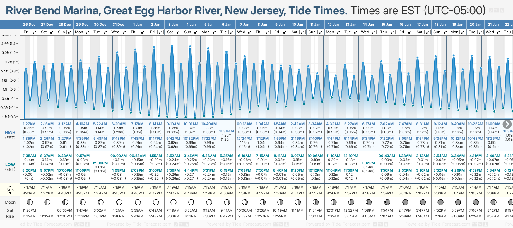 River Bend Marina, Great Egg Harbor River tide times for December and January