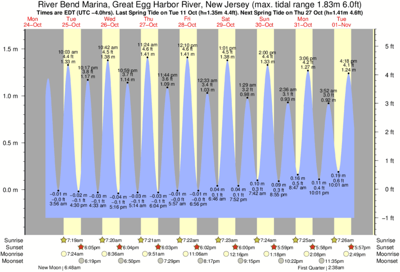 Tide Times are EST (UTC -5.0hrs). Last Spring High Tide at River Bend Marina, Great Egg Harbor River was on Sat 20 Dec (height: 1.19m 3.9ft). Next high Spring Tide at River Bend Marina, Great Egg Harbor River will be on Sat 03 Jan (height: 1.38m 4.5ft).