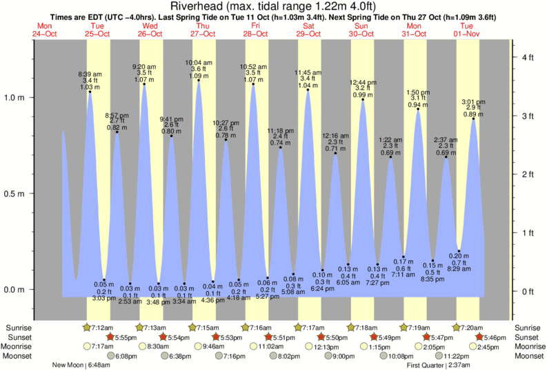Tide Times are EST (UTC -5.0hrs). Last Spring High Tide at Riverhead was on Sat 20 Dec (height: 0.96m 3.1ft). Next high Spring Tide at Riverhead will be on Sat 03 Jan (height: 1.15m 3.8ft).