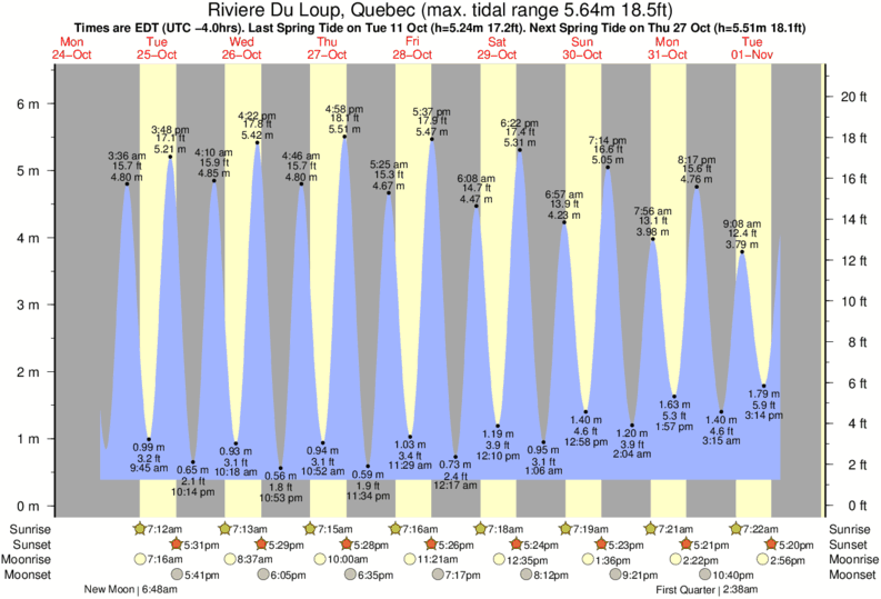 Tide Times are EST (UTC -5.0hrs). Last Spring High Tide at Riviere Du Loup was on Sat 06 Dec (height: 5.97m 19.6ft). Next high Spring Tide at Riviere Du Loup will be on Sun 21 Dec (height: 5.10m 16.7ft).