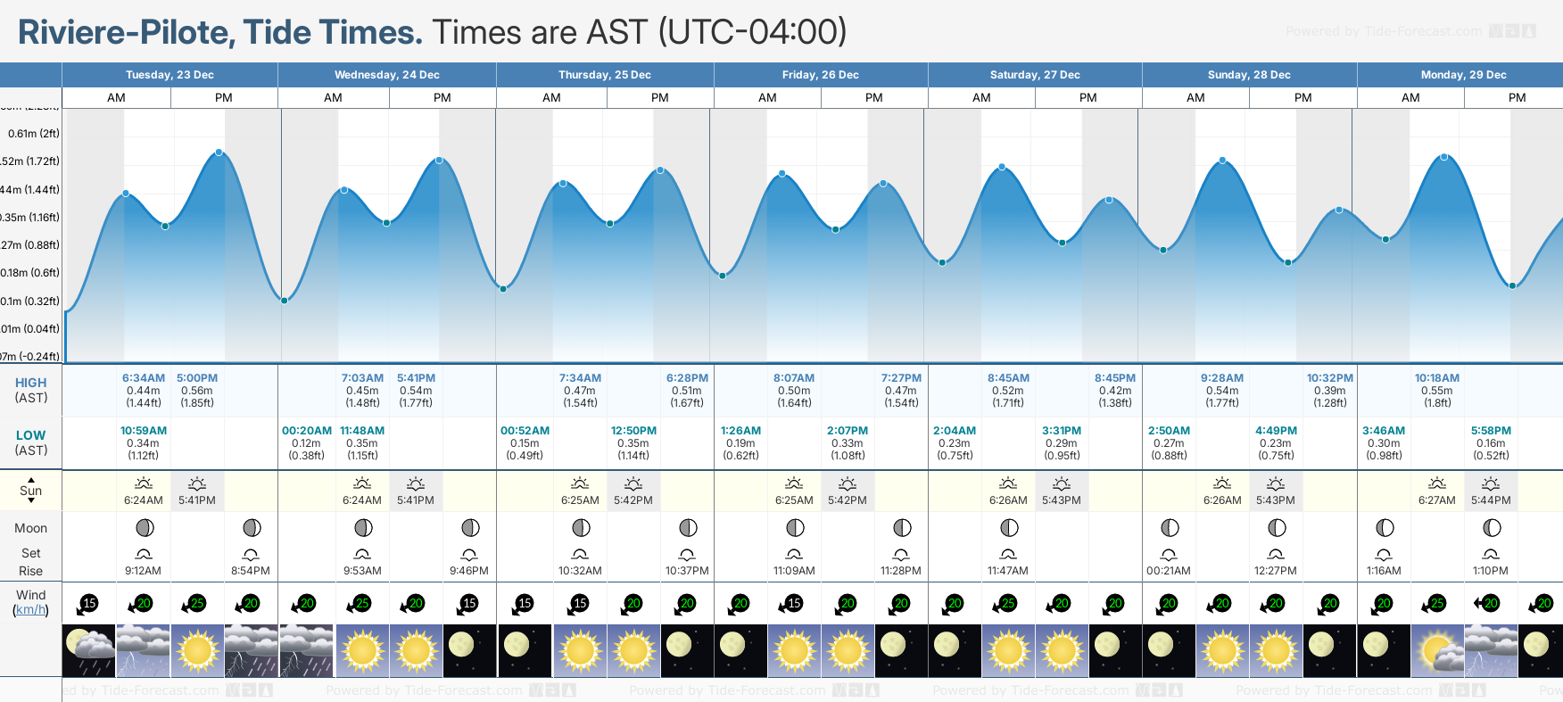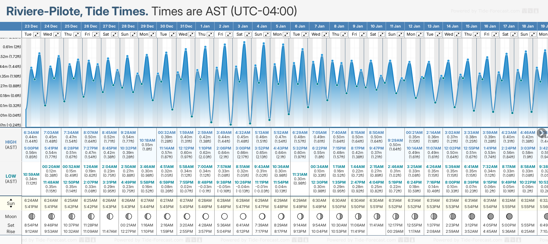 December and January Tide charts for Riviere-Pilote: The tide charts below show the height, time and date of high and low tides for the next 30 days.