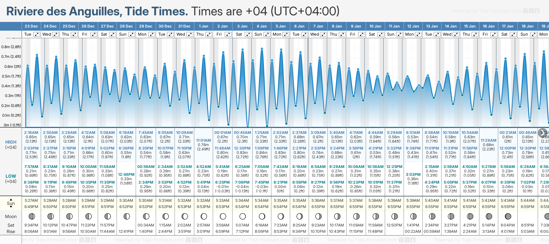 Tide Times are +04 (UTC +4.0hrs). Last Spring High Tide at Riviere des Anguilles was on Sun 21 Dec (height: 0.77m 2.5ft). Next high Spring Tide at Riviere des Anguilles will be on Sun 04 Jan (height: 0.84m 2.8ft).