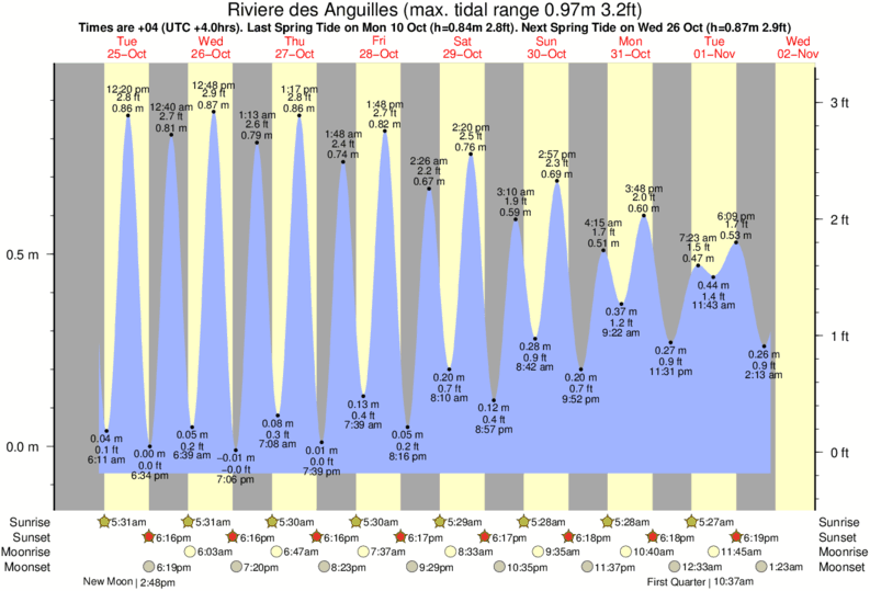 Tide Times are +04 (UTC +4.0hrs). Last Spring High Tide at Riviere des Anguilles was on Fri 05 Dec (height: 0.85m 2.8ft). Next high Spring Tide at Riviere des Anguilles will be on Sun 21 Dec (height: 0.77m 2.5ft).