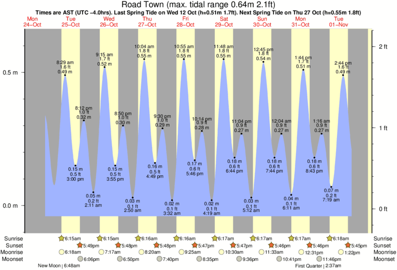 Tide Times are AST (UTC -4.0hrs). Last Spring High Tide at Road Town was on Sat 06 Dec (height: 0.60m 2.0ft). Next high Spring Tide at Road Town will be on Mon 22 Dec (height: 0.50m 1.6ft).
