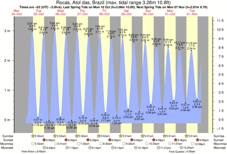 Tide Times are -02 (UTC -2.0hrs). Last Spring High Tide at Rocas, Atol das was on Sat 20 Dec (height: 2.69m 8.8ft). Next high Spring Tide at Rocas, Atol das will be on Sat 03 Jan (height: 2.94m 9.6ft).