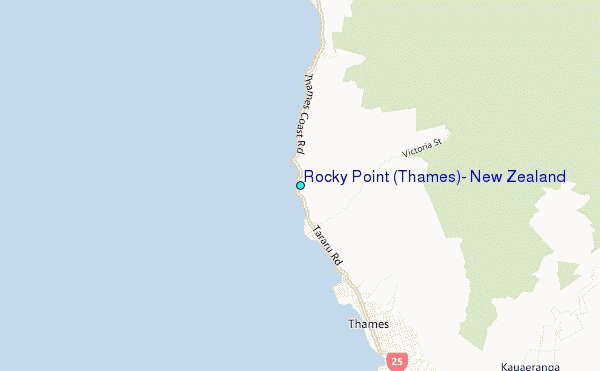 Use this relief map to navigate to tide stations, surf breaks and cities that are in the area of Rocky Point (Thames), New Zealand.