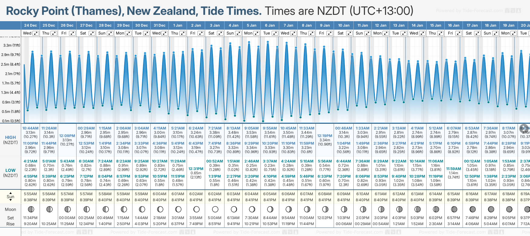 Rocky Point (Thames) tide chart key: The tide chart above shows the height and times of high tide and low tide for Rocky Point (Thames), New Zealand. The grey shading corresponds to nighttime hours between sunset and sunrise at Rocky Point (Thames).