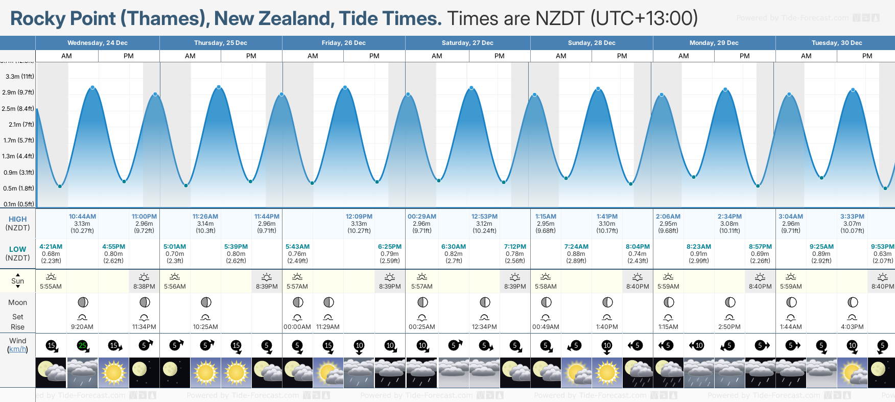 December and January Tide charts for Rocky Point (Thames): The tide charts below show the height, time and date of high and low tides for the next 30 days.