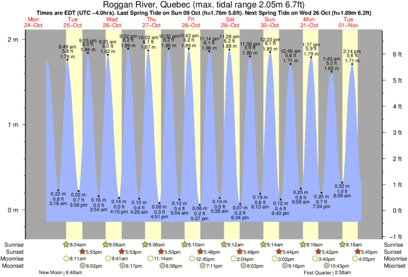 Tide Times are EST (UTC -5.0hrs). Last Spring High Tide at Roggan River was on Thu 04 Dec (height: 1.83m 6.0ft). Next high Spring Tide at Roggan River will be on Fri 26 Dec (height: 1.81m 5.9ft).