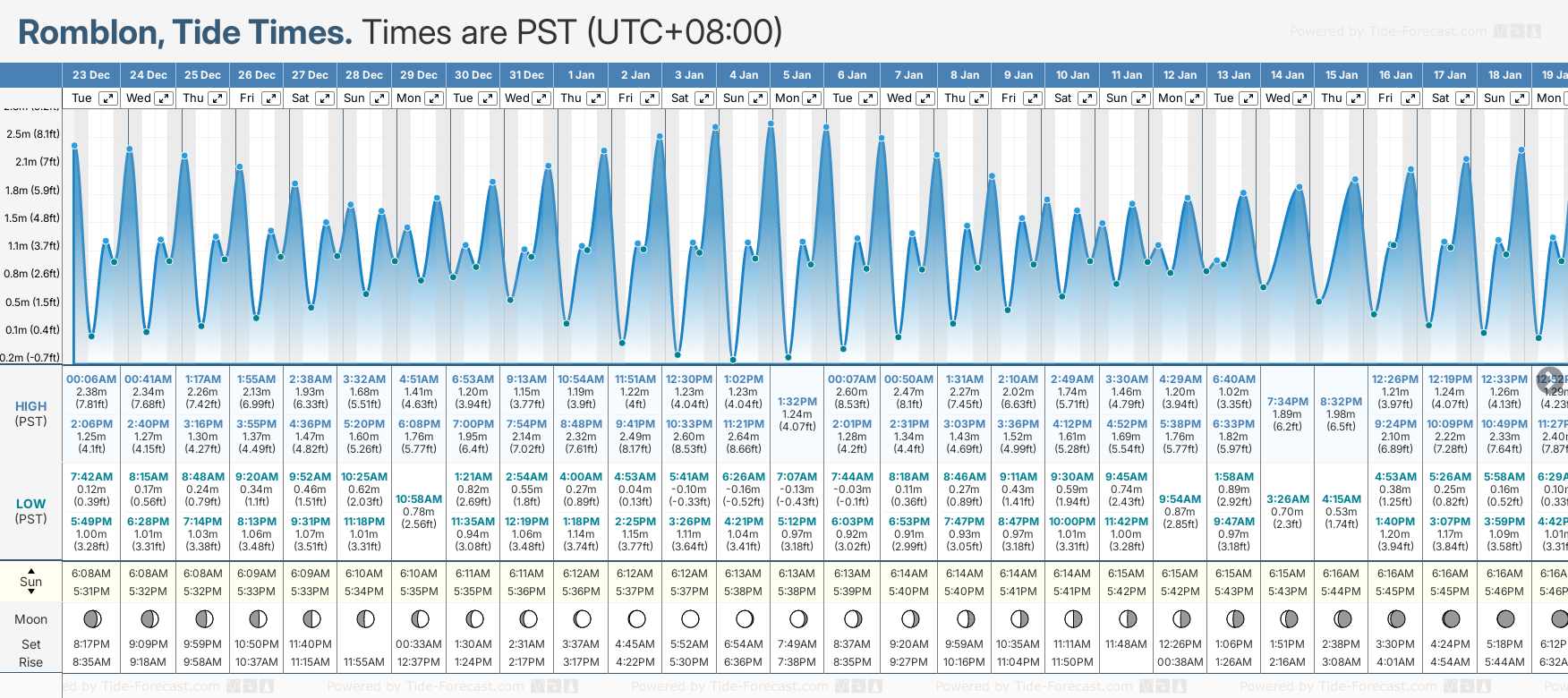 December and January Tide charts for Romblon: The tide charts below show the height, time and date of high and low tides for the next 30 days.