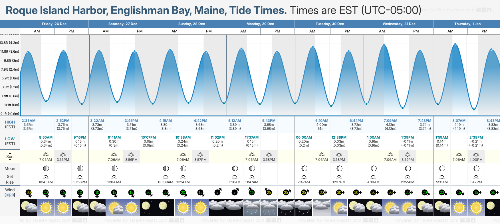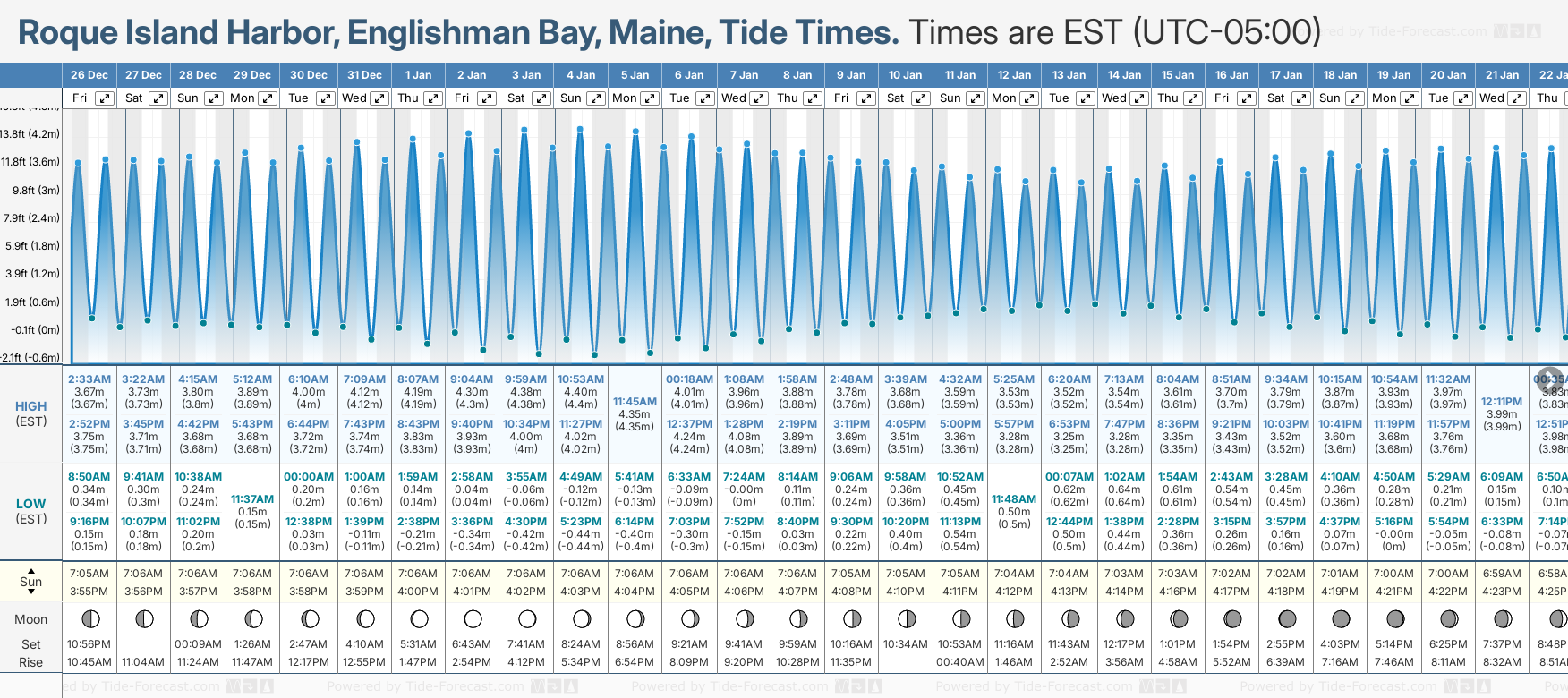December and January Tide charts for Roque Island Harbor, Englishman Bay: The tide charts below show the height, time and date of high and low tides for the next 30 days.