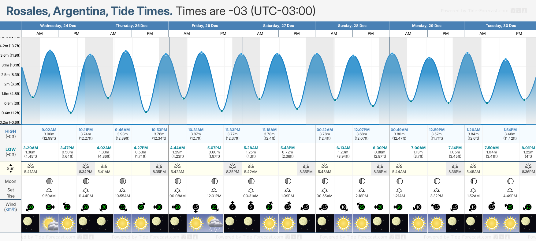 Tide chart for RosalesShowing low and high tide times for the next 30 days at Rosales. Tide Times are -03 (UTC -3.0hrs).