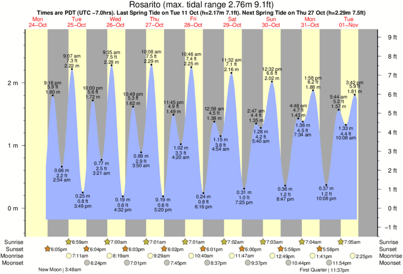 Tide Times are PST (UTC -8.0hrs). Last Spring High Tide at Rosarito was on Fri 05 Dec (height: 2.57m 8.4ft). Next high Spring Tide at Rosarito will be on Sat 20 Dec (height: 2.23m 7.3ft).