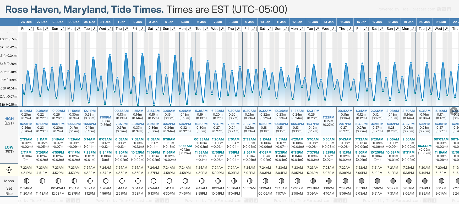 Tide Times are EST (UTC -5.0hrs). Last Spring High Tide at Rose Haven was on Sat 20 Dec (height: 0.32m 1.0ft). Next high Spring Tide at Rose Haven will be on Thu 01 Jan (height: 0.37m 1.2ft).