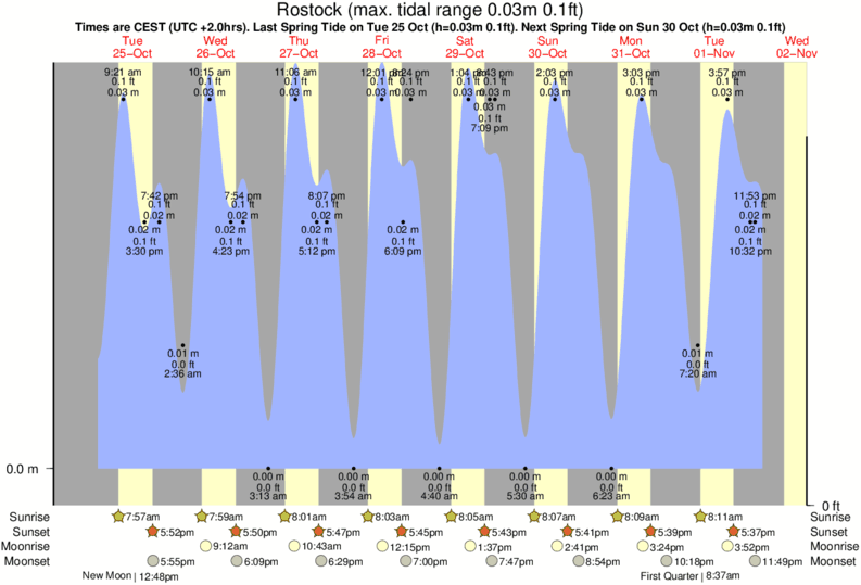 Tide Times are CET (UTC +1.0hrs). Last Spring High Tide at Rostock was on Sun 21 Dec (height: 0.03m 0.1ft). Next high Spring Tide at Rostock will be on Fri 26 Dec (height: 0.03m 0.1ft).