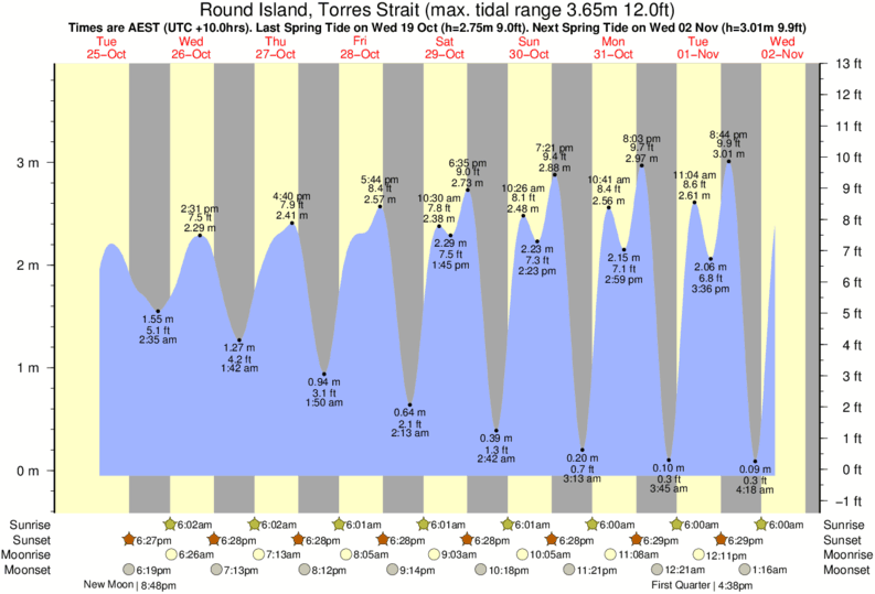 Tide Times are AEST (UTC +10.0hrs). Last Spring High Tide at Round Island was on Sat 13 Dec (height: 2.95m 9.7ft). Next high Spring Tide at Round Island will be on Sun 21 Dec (height: 3.14m 10.3ft).