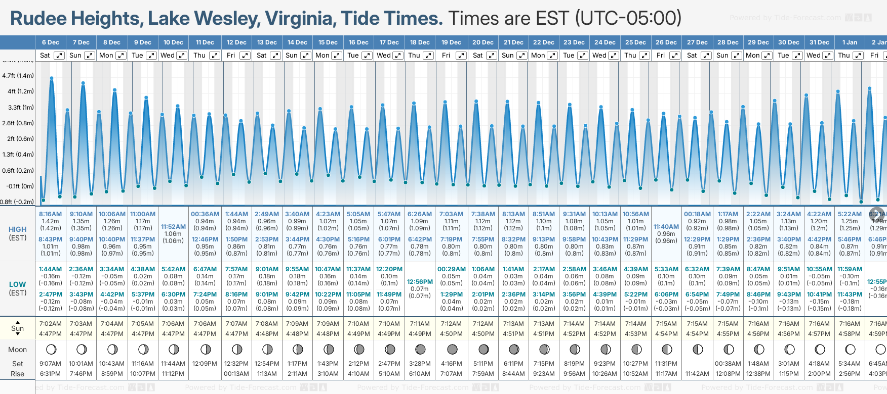 Tide Times are EST (UTC -5.0hrs). Last Spring High Tide at Rudee Heights, Lake Wesley was on Fri 05 Dec (height: 1.45m 4.8ft). Next high Spring Tide at Rudee Heights, Lake Wesley will be on Sat 20 Dec (height: 1.12m 3.7ft).