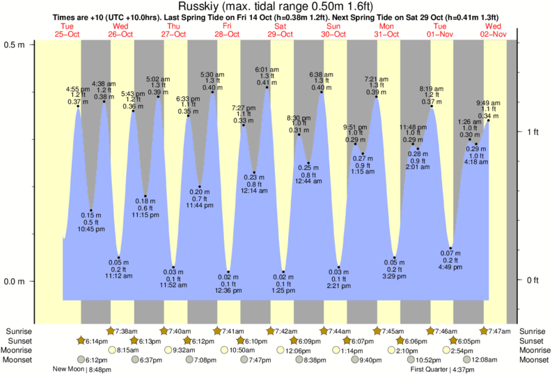 Tide chart for RusskiyShowing low and high tide times for the next 30 days at Russkiy. Tide Times are +10 (UTC +10.0hrs).