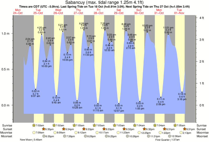 Tide Times are CST (UTC -6.0hrs). Last Spring High Tide at Sabancuy was on Sat 20 Dec (height: 1.01m 3.3ft). Next high Spring Tide at Sabancuy will be on Fri 02 Jan (height: 1.11m 3.6ft).