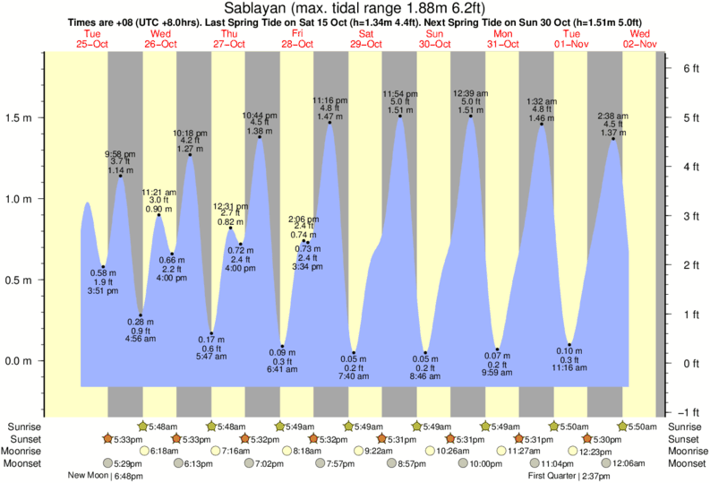 Tide Times are PST (UTC +8.0hrs). Last Spring High Tide at Sablayan was on Sun 07 Dec (height: 1.72m 5.6ft). Next high Spring Tide at Sablayan will be on Tue 23 Dec (height: 1.51m 5.0ft).