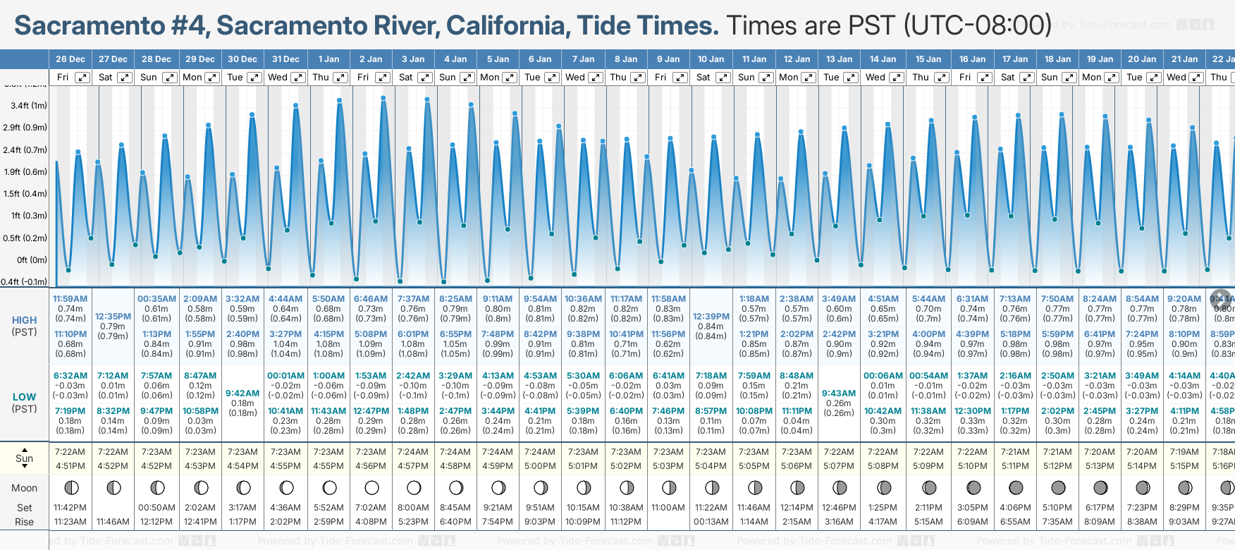 Tide Times are PST (UTC -8.0hrs). Last Spring High Tide at Sacramento #4, Sacramento River was on Sun 21 Dec (height: 0.97m 3.2ft). Next high Spring Tide at Sacramento #4, Sacramento River will be on Fri 02 Jan (height: 1.09m 3.6ft).