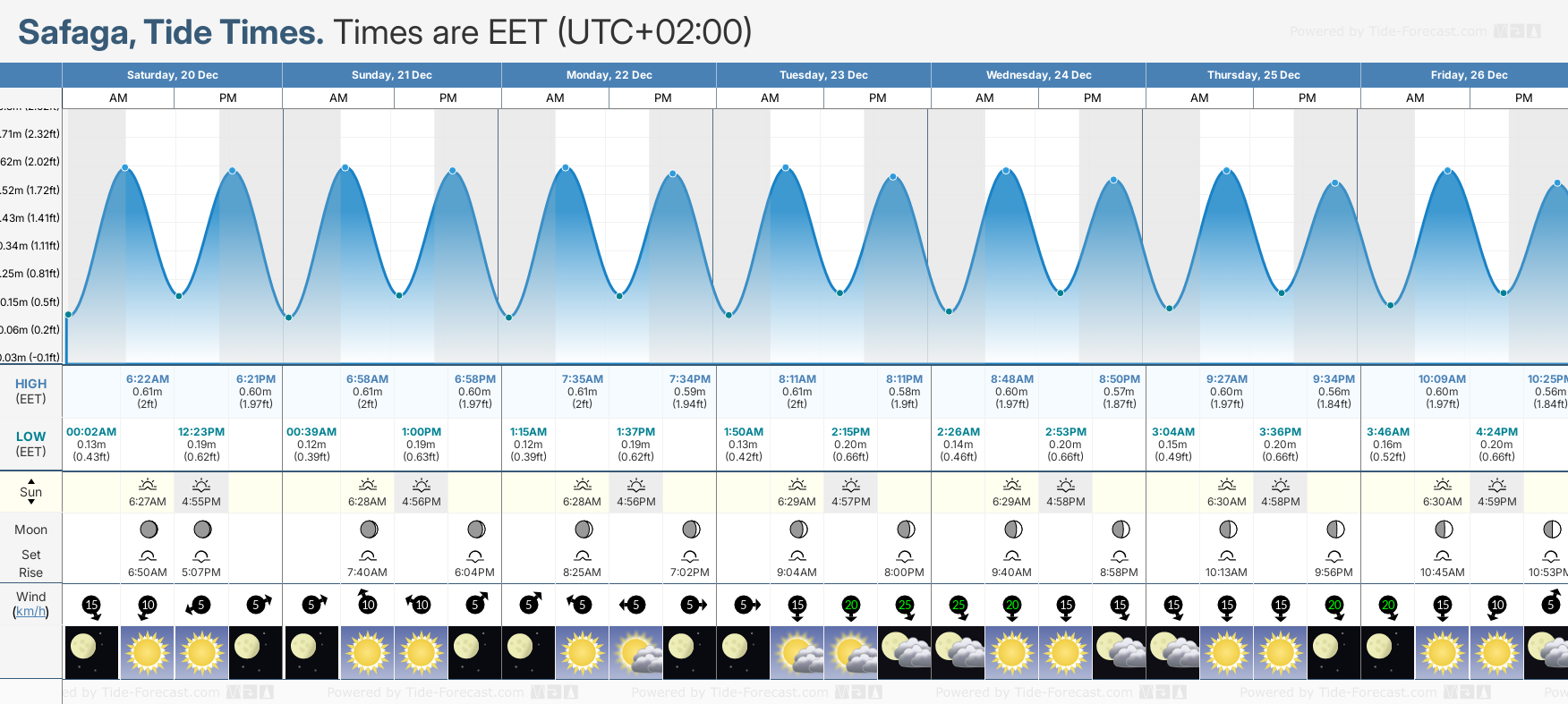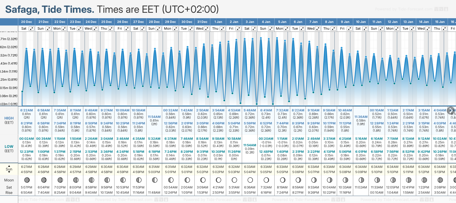 December and January Tide charts for Safaga: The tide charts below show the height, time and date of high and low tides for the next 30 days.