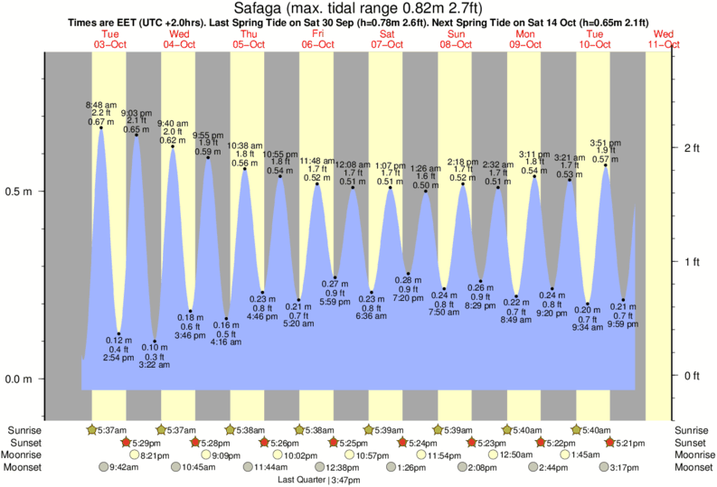 Tide chart for SafagaShowing low and high tide times for the next 30 days at Safaga. Tide Times are EET (UTC +2.0hrs).