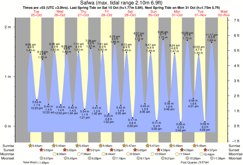 Tide Times are +03 (UTC +3.0hrs). Last Spring High Tide at Safwa was on Wed 10 Dec (height: 1.96m 6.4ft). Next high Spring Tide at Safwa will be on Wed 24 Dec (height: 1.78m 5.8ft).